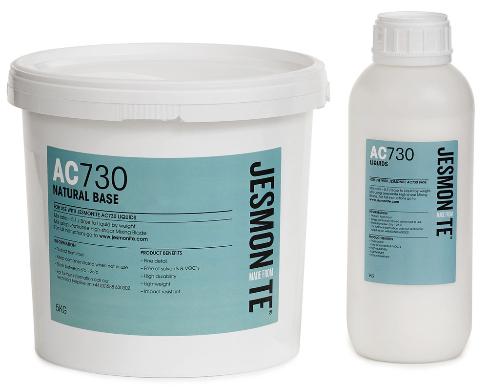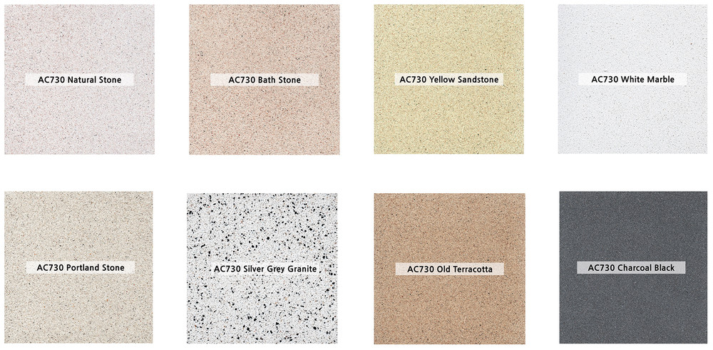 AC730은 시멘트 기반의 제스모나이트 제품으로 미네랄 베이스 가루와 아크릴 액체를 혼합하여 사용합니다. 베이스의 골재와 안료의 혼합에 따라 다양한 석재 마감이 가능한 것이 특징입니다. 총 8가지 타입으로 바스스톤(Bath Stone),차콜 블랙 (Charcoal Black), 내추럴 스톤 (Natural Stone), 올드 테라코타 (Old Terracotta), 포틀랜드 스톤 (Portland Stone), 실버 그레이 그라나이트 (Silver Grey Granite), 화이트 마블 (White Marble), 옐로우 스톤 (Yellow Stone)이 있습니다. AC730은 작은 오브제 캐스팅 및 유리 섬유를 보강한 적층 판재, FRP를 만드는 데 적합 합니다. AC730은 인체의 안전을 고려한 솔벤트 프리 제품(VOC free) 제품으로 BS (영국인증) 내화 인증을 받았습니다.